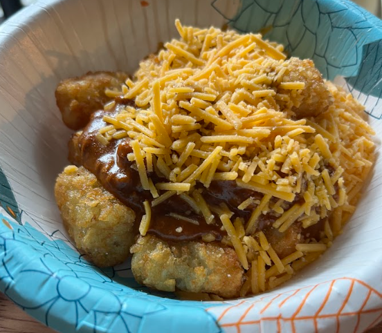 Prepare tater tots in bowls as base. Top with chili and cheese. Finish with other toppings to make it your own!