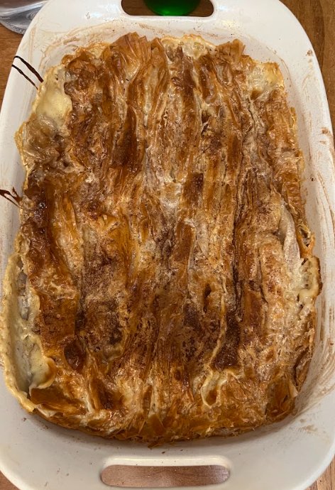 Transfer the dish back to the oven for another 5-10 minutes until the edges start to bubble, the phyllo has soaked in most of the milk/cream mixture and is no longer soupy.